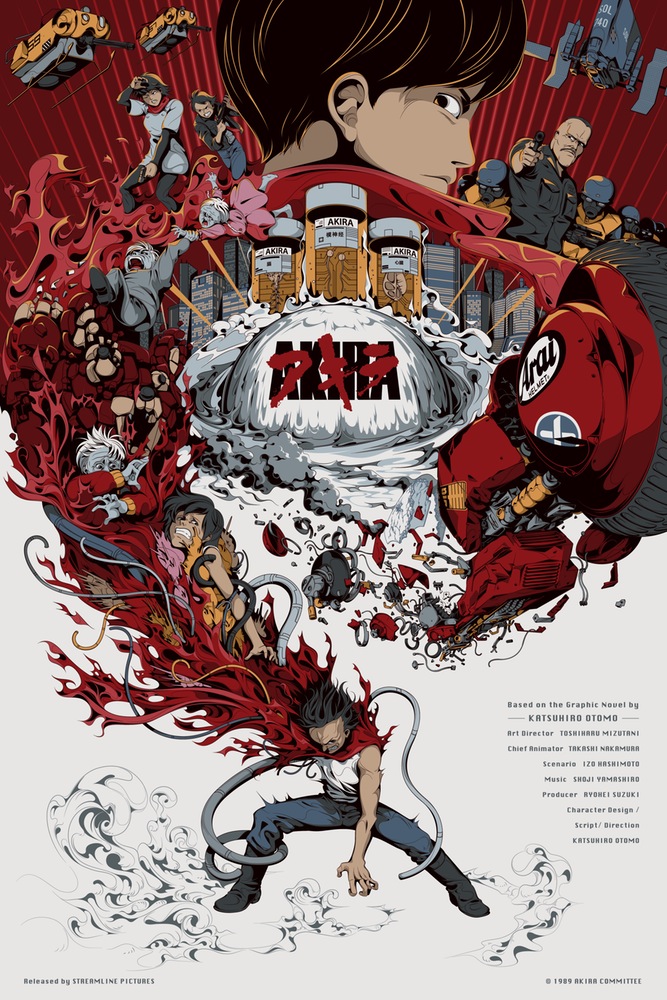 A film rendezője, Katsuhiro Otomo, a saját mangájából készítette el az Akirát, mely a japán képregény csak egy kis szeletét sűríti magába. Otomo 1984 és 1993 között hat vaskos kötetben jelentette meg a sztorit teljes terjedelmében, de mikor nem jutott dűlőre a befejezést illetően, hosszasan beszélgetett a Chilében született rendezővel, Alejandro Jodorowskyval, aki végül meghozta az ihletet. Érdekesség, hogy ez volt az első manga, amit lefordítottak és megjelentettek nyugaton. A belőle készült animáció 2019-ben játszódik, pont abban az évben, amikor a Szárnyas Fejvadász (Blade Runner, 1982) története is – ez persze nem véletlen. Otomo hatalmas inspirációként tekintett Ridley Scott klasszikusára. Az az épülő stadion, ahol a végső katartikus jelenet játszódik, a film szerint egy leendő japán olimpiára készül. Furcsa egybeesés, hogy a valóságban japán van előjegyezve a 2020-as olimpia megrendezésére. A film színezése során rekordszámú, háromszázhuszonhét különféle színt alkalmaztak, amihez még hozzájött plusz ötven, amit direkt ehhez a produkcióhoz kevertek ki a grafikusok, akik az egész film animálás során teljes egészében CGI nélkül, kézzel dolgoztak. Alább egy kis poszter válogatás galériába szedve, érdemes belenézni: